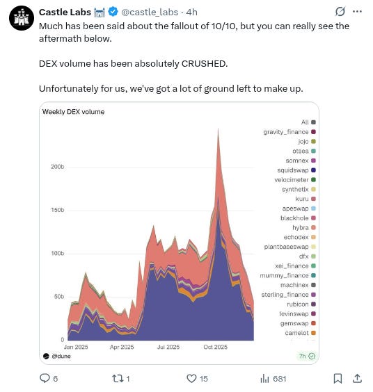 -Absolutely fascinating chart from @castle_labs showing the decline in dex volumes since 10/10: