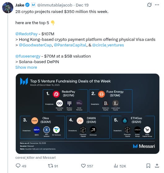 -Top 5 new projects by fundraising numbers this week were @RedotPay, @fuseenergy, @OleaTrade, @dawninternet, and @ETHGasOfficial… h/t @immutablejacob (click to read in full):