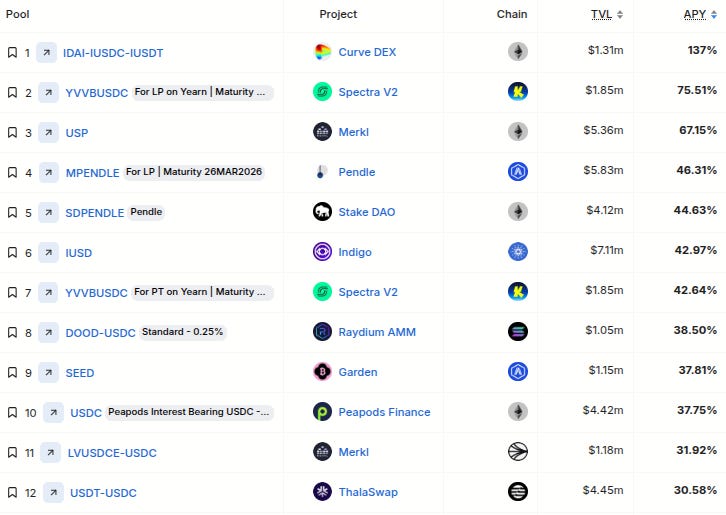 (note: these are the top Stablecoin Yields, sourced from @DefiLlama (all types, $1M+ TVL only) - note: these lists are just raw data, make sure to always DYOR before interacting with any/all protocols)