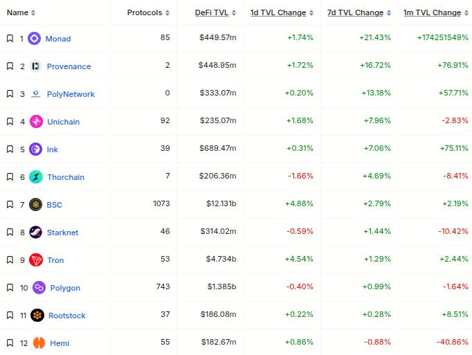 Chains are mostly red today. Only top 25 chains green on the weekly are BSC (#3), Tron (#8), Polygon (#12), Ink (#14), Monad (#21), and Providence (#22).
