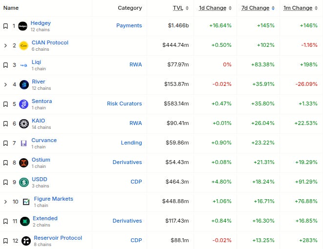 Here’s The Top 12 Fastest-Growing Protocols By TVL On The Weekly With At Least $50M TVL (from @DefiLlama):