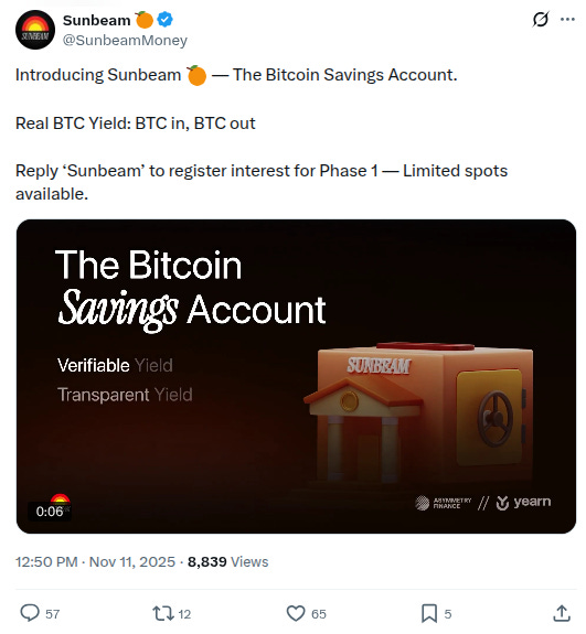 -New project called @SunbeamMoney. Twitter bio states “The Bitcoin Savings Account. Real Yield in BTC by @asymmetryfin x @yearnfi Coming very soon.” Followed by 6 of our mutuals. h/t @AresLabs_xyz: