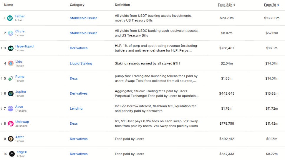 Here’s The Top 12 Entities By 7 Day Fee Generation (from @DefiLlama):
