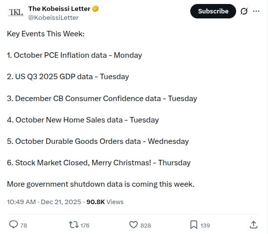 -Quiet week in macro with Christmas coming on Thursday, h/t @KobeissiLetter: