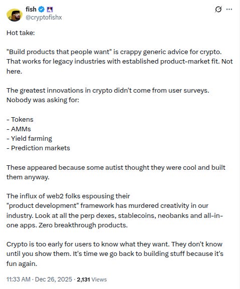 -“Crypto is too early for users to know what they want. They don't know until you show them. It's time we go back to building stuff because it's fun again.” - good hot take from Trader Joe co-founder @cryptofishx: