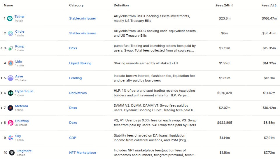 Here’s The Top 12 Entities By 7 Day Fee Generation (from @DefiLlama):
