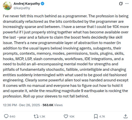 -“I’ve never felt this behind as a programmer” - interesting thoughts on AI from Andrej Karpathy: