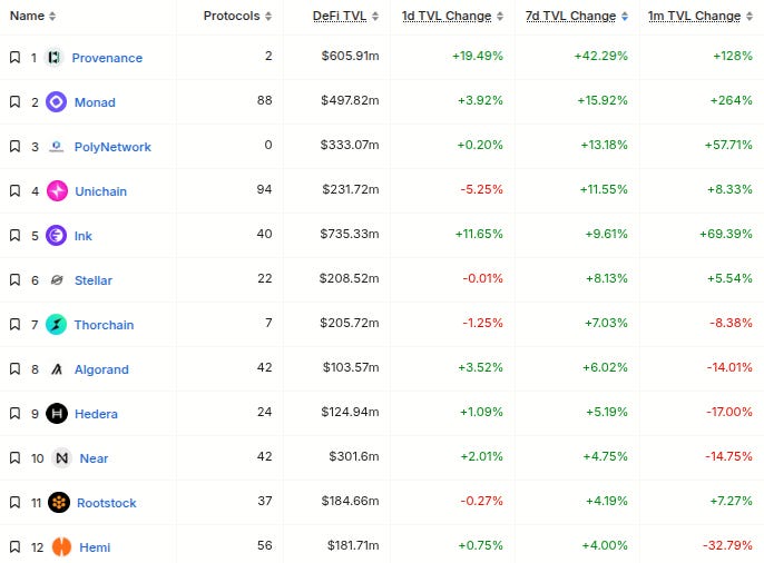 Chains are mixed today. Ink (#14), Provenance (#17), and Monad (#20) are all up at least 50% on the monthly.