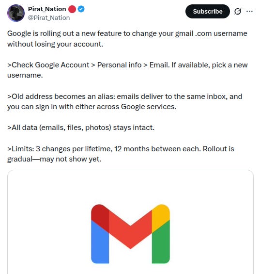-Interesting crypto-adjacent note re: Gmail and allowing users to update their email addresses, h/t @Pirat_Nation: