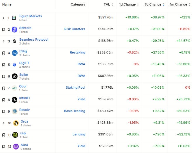 Here’s The Top 12 Fastest-Growing Protocols By TVL On The Weekly With At Least $100M TVL (from @DefiLlama):