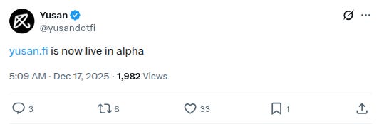 -New project called @yusandotfi has been added to @DefiLlama, categorized as a multichain lending protocol. Twitter bio states “Cross-chain lending protocol. Deposit BTC natively on Bitcoin, and borrow USDC on Base.” Followed by 1 of our mutuals.