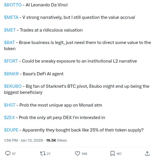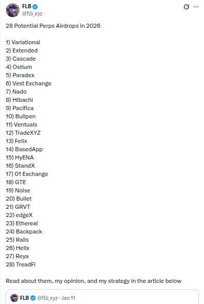 -Good list of tokenless perps projects worth potentially farming or at least looking into, from @flb_xyz, with link to his full article discussing all of them within it: