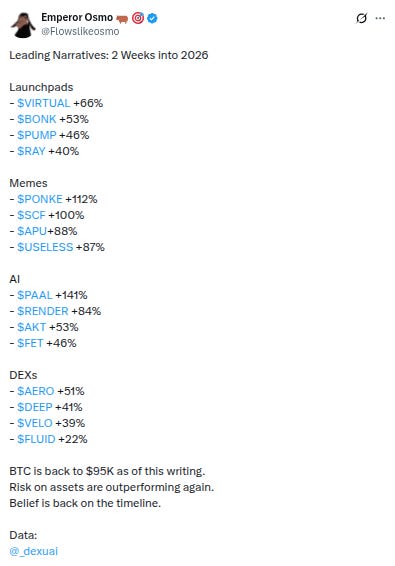 -A number of narratives are doing quite decent so far this year, including some dex tokens, h/t @Flowslikeosmo: