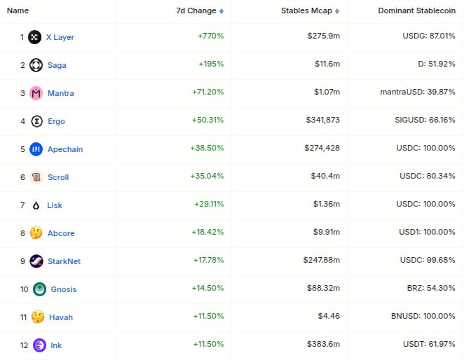 Here’s The Top 12 Chains By 7 Day Stablecoin Inflow % (from @DefiLlama):