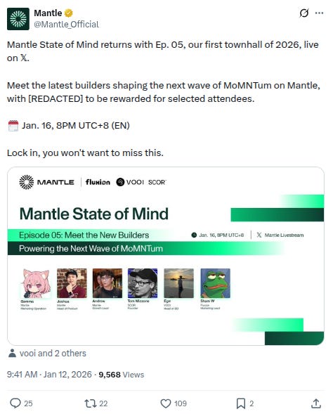 “Mantle State of Mind returns with Ep. 05, our first townhall of 2026, live on 𝕏.