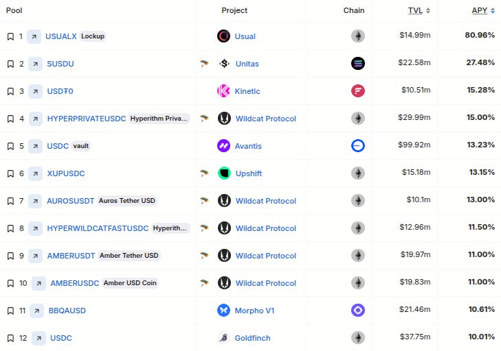 (note: these are the top Stablecoin Yields, sourced from @DefiLlama (no yield tokens, single-exposure, $10M+ TVL only) - note: these lists are just raw data, make sure to always DYOR before interacting with any/all protocols)