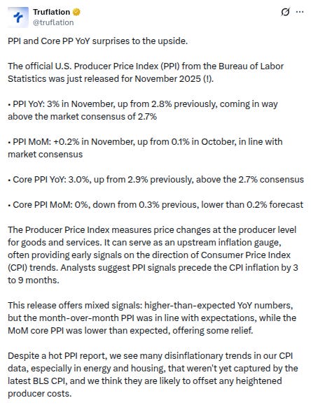 -PPI (inflation) data came in slightly above expectations today, with many wondering whether this will further complicate the Trump vs Powell interest rates situation, h/t @truflation: