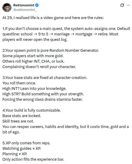 -“XP only comes from reps. Watching guides ≠ XP. Planning ≠ XP. Only action fills the experience bar.” - parting wisdom from @rektonomist_:
