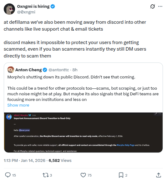 -Interesting discussion about Morpho shutting down its Discord and whether more projects will be doing the same, from @0xngmi and @antonttc:
