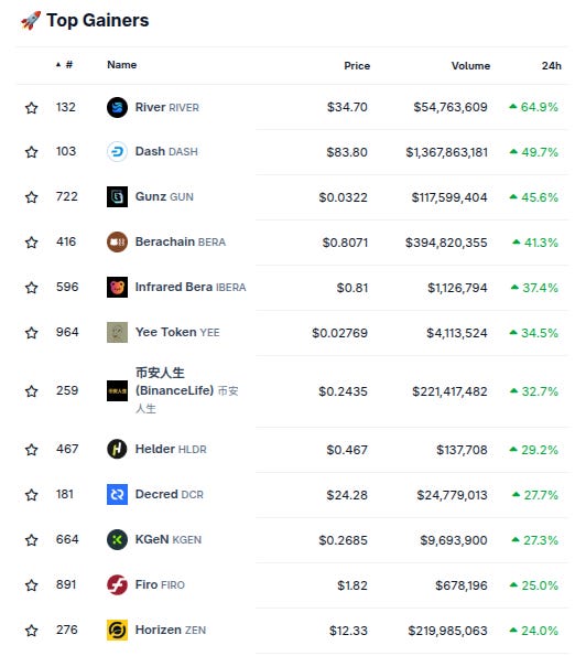 Protocols are also quite green today. Fastest-growing top 25 protocol on the weekly is Sanctum (#24) at +20.55%.