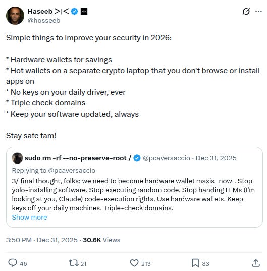 -Remember to be hypervigilant with security this year friends! Good reminder from @hosseeb below - especially re: having a separate laptop or Chromebook just for crypto and also triple-checking URL’s and addresses: