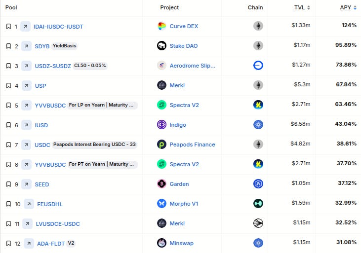 (note: these are the top Stablecoin Yields, sourced from @DefiLlama (all types, $1M+ TVL only) - note: these lists are just raw data, make sure to always DYOR before interacting with any/all protocols)