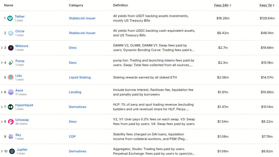 Here’s The Top 10 Entities By 7 Day Fee Generation (from @DefiLlama):