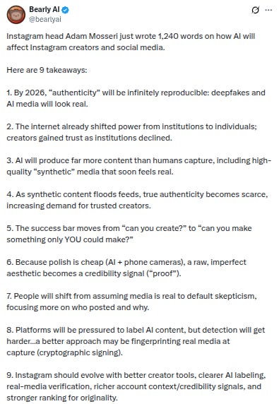 -“The success bar moves from “can you create?” to “can you make something only YOU could make?” - one of nine interesting predictions regarding AI and the internet from Instagram’s Adam Mosseri, c/o @bearlyai: