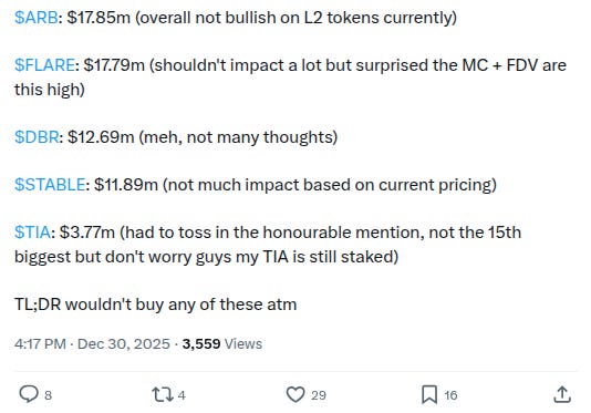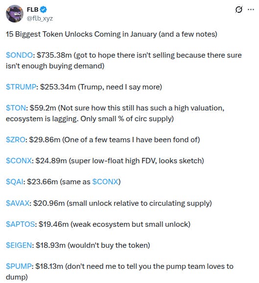 -Lots of unlocks coming in January, good list below with thoughts on various tokens as well, also from @flb_xyz: