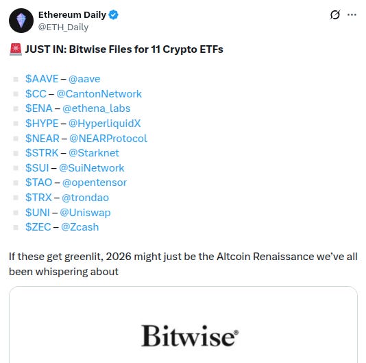 -Bitwise has filed for a bunch of new altcoin ETF’s, h/t @ETH_Daily: