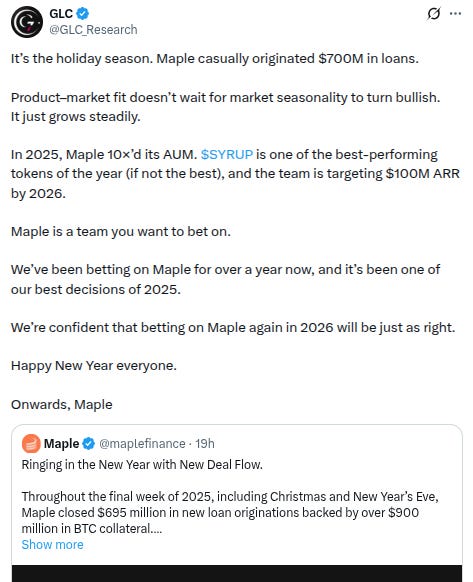 “Throughout the final week of 2025, including Christmas and New Year’s Eve, Maple closed $695 million in new loan originations backed by over $900 million in BTC collateral…”