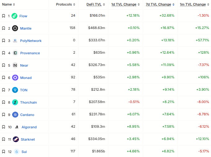 Chains are quite green today. Only top 25 chains red on the weekly are Hyperliquid (#9), Polygon (#12), Katana (#13), Berachain (#20), and Linea (#23).