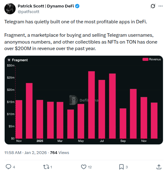 -Telegram continues to be a fascinating dark horse in the crypto and tech worlds as we enter 2026, h/t @patfscott: