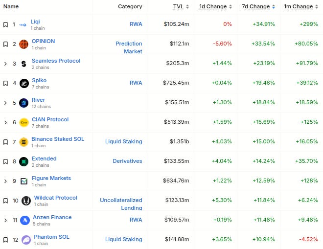 Here’s The Top 12 Fastest-Growing Protocol By TVL On The Weekly With At Least $100M TVL (from @DefiLlama):