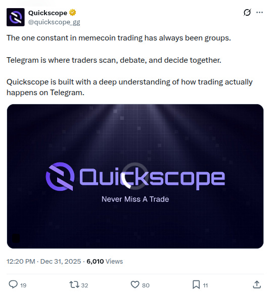-New project called @quickscope_gg. Twitter bio states “Custom trading terminal that rewards users for the alpha they share.” Followed by 12 of our mutuals. h/t @0xvietnguyen: