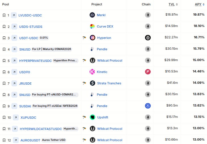 (note: these are the top Stablecoin Yields, sourced from @DefiLlama (all types, $10M+ TVL only) - note: these lists are just raw data, make sure to always DYOR before interacting with any/all protocols)