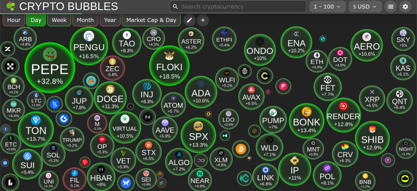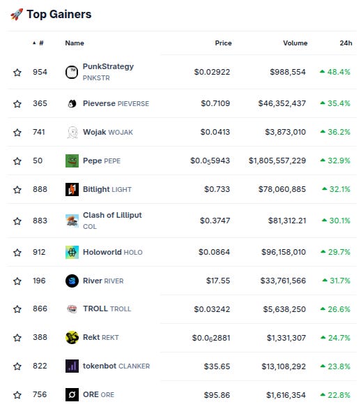 Protocols are quite green today as well. Only top 25 protocols red on the weekly are Spark (#6), Ethena (#8), Sky (#9), Pendle (#14), Curve Finance (#20), Tether Gold (#23), and Lista DAO (#25).