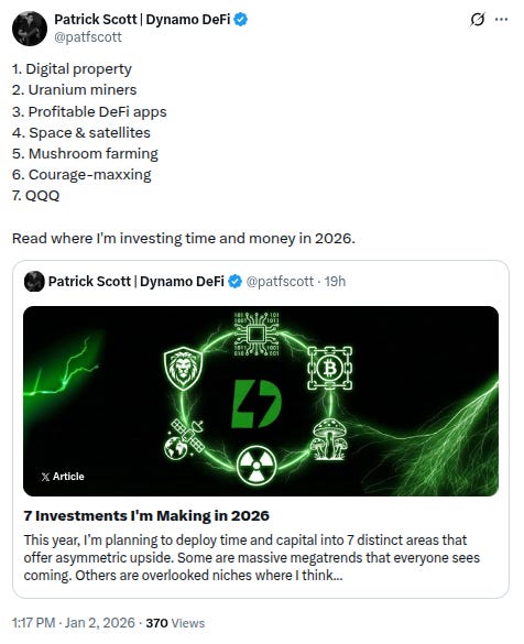 -Excellent article of 2026 investment ideas and general life thoughts, from the aforementioned @patfscott:
