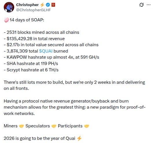 Using SOAP, when a block producer produces a block - they get rewarded in 2 tokens: the normal $QUAI (or $QI) reward, and then the subsidy chain of their choice (LTC, DOGE, BCH, RVN to start with). That subsidy chain reward is routed to the network, sold at market, and then used to buyback $QUAI…”