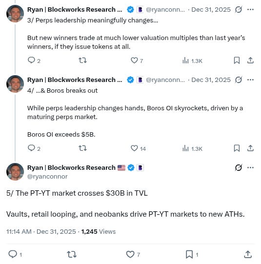 -@ryanconnor offered a thread of 2026 predictions, including bullish thoughts on AI, institutional privacy, and Pendle’s Boros product: