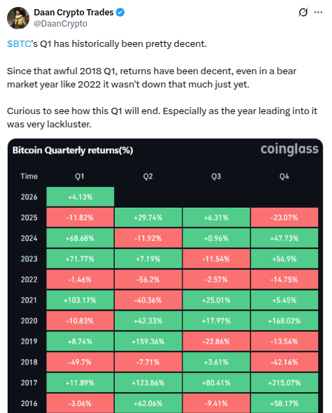 -Q1 for Bitcoin has historically been pretty decent, h/t @DaanCrypto: