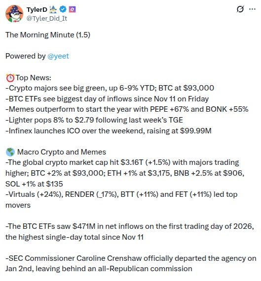 -Memecoins are leading as crypto bounces to start year, h/t @Tyler_Did_It: