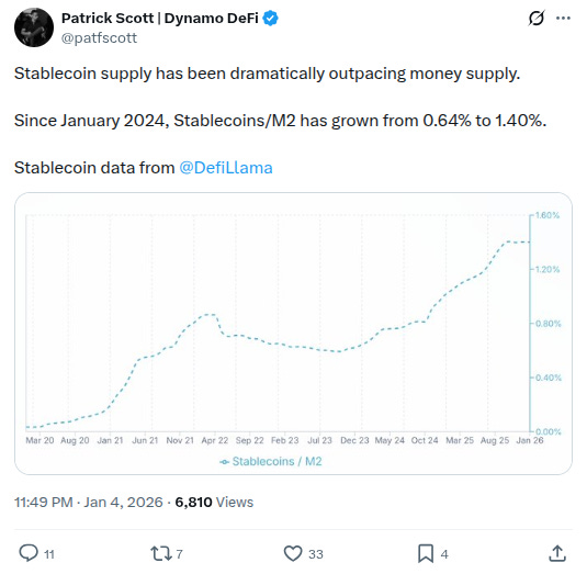 -Stablecoin supply has been dramatically outperforming money supply growth, h/t interesting chart from @patfscott showing the relationship going back 4 years, with a decline in the depths of the bear market and then a steady ascendancy since late 2023 with just a small flatlining over the last month or two: