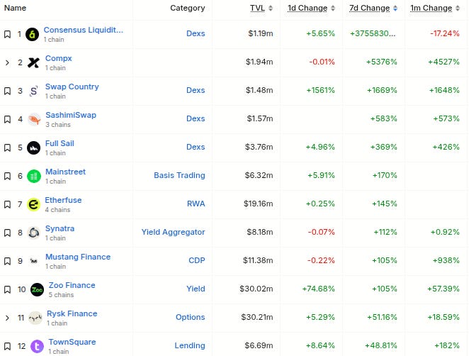 Here’s The Top 12 Fastest-Growing Protocol By TVL On The Weekly With At Least $1M TVL (from @DefiLlama):