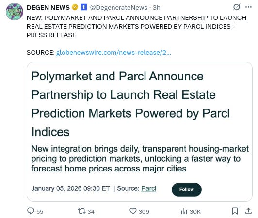 -Polymarket and Parcl are partnering to launch real estate prediction markets: