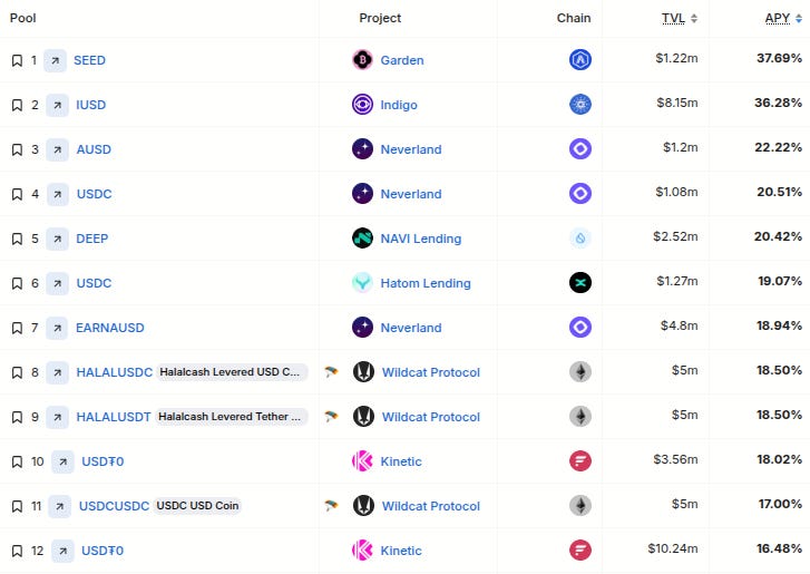 (note: these are the top Stablecoin Yields, sourced from @DefiLlama (no yield tokens, single-exposure, $1M+ TVL only) - note: these lists are just raw data, make sure to always DYOR before interacting with any/all protocols)