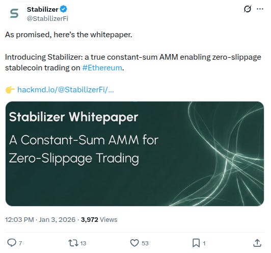 -Something new called @StabilizerFi. Twitter bio states “Zero-slippage stablecoin DEX 🤖” Followed by 2 of our mutuals. h/t @0xvietnguyen: