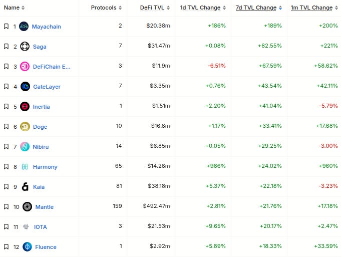 Here’s The Top 12 Fastest-Growing Chains By TVL On The Weekly With At Least $1M TVL (from @DefiLlama):